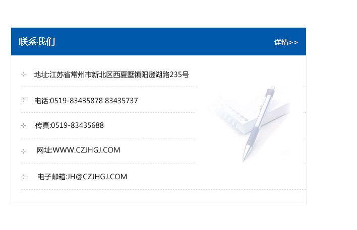 地址:常州市新北區友邦商務大廈1幢16、17層  電話:0519-85101652  傳真:0519-85112595  郵編:213022  網址:www_cz-jiayue_cn.xktron.com  郵箱:xiajifengaa@163.com